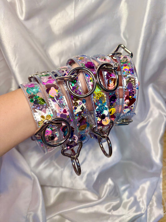 Slick, Shiny, and Glittering: Welcome to the squeaky and sexy world of GNAT Glitter Kink. Everything here is PLASTIQUE, baby! We delight in the constrictive cinch and heavy hardware of a glitter vinyl harness. Vinyl & PVC are closer to the slick and sweat-inducing erotic experience of latex, so get ready to turn yourself into the dolly of your dreams, and slip into something sparkly!